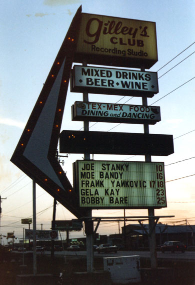 Marquee showing Joe Stanky & the Cadets appearing at Gilley's, Pasadena, TX, along with legends Moe Bandy, Frank Yankovic, Gela Kay, and the famous Bobby Bare. |