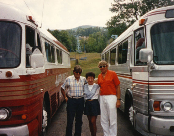 Happy Louie and his red bus. Corrine Stanky and Joe Stanky with his silver bullet bus. Hunter Mountain, NY |
